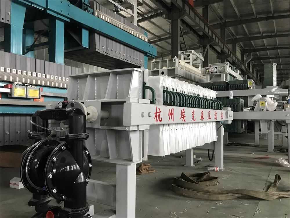 隔膜壓榨壓濾機是由隔膜板和廂式濾板排列組成濾室,在輸料泵的壓力作用下將料漿輸入濾室,通過過濾介質(濾布)將料漿中的固體和液體分離,當料漿中的固體形成餅后,再向隔膜通入空氣,對濾室內的固體充分壓榨。